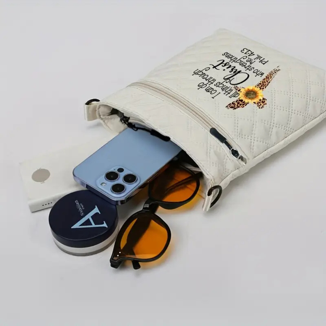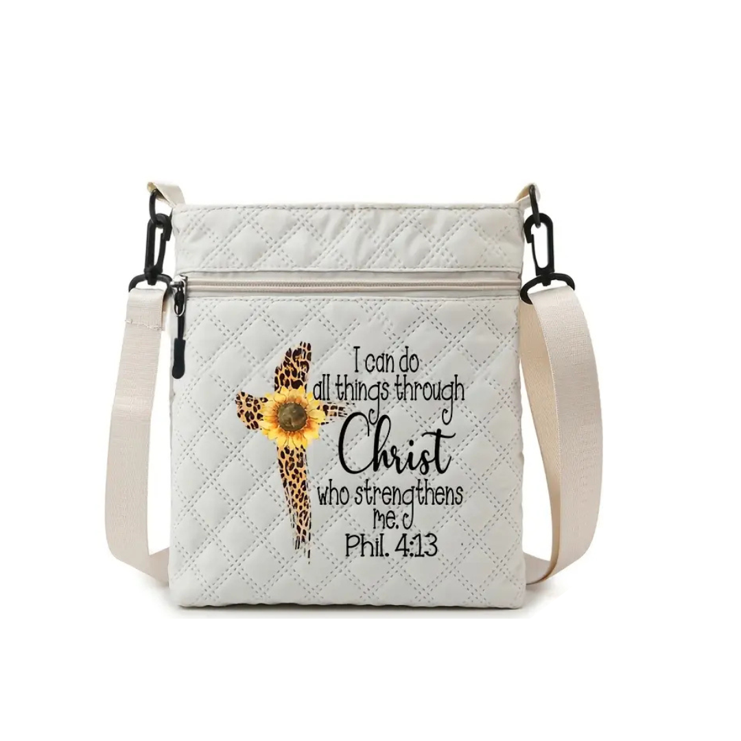 Carry faith and confidence wherever you go with this elegant White Crossbody Bag featuring the empowering message “I Can Do All Things” inspired by Philippians 4:13. Compact yet spacious, it’s perfect for your daily essentials with a clean, modern design and adjustable strap for all-day comfort. A beautiful blend of style and inspiration—ideal for everyday use, gifting, or faith-filled adventures.